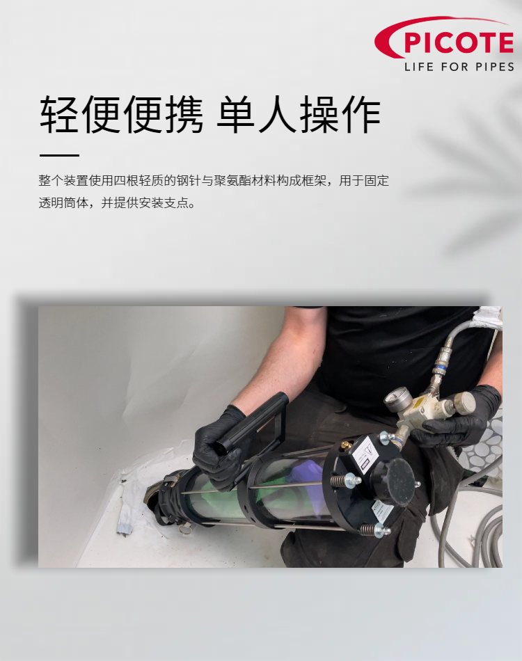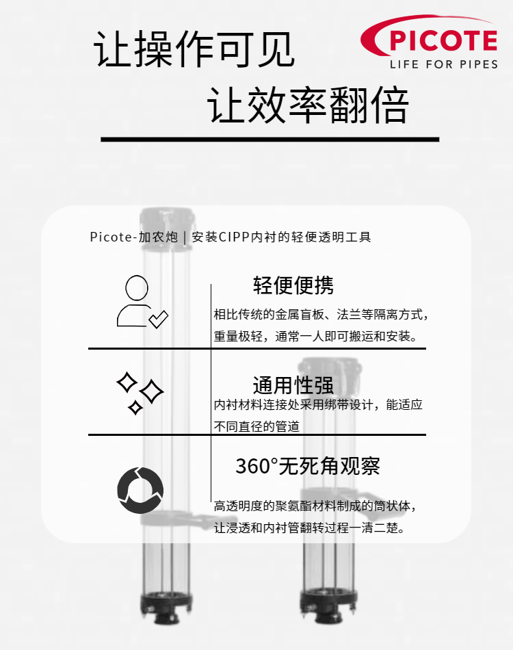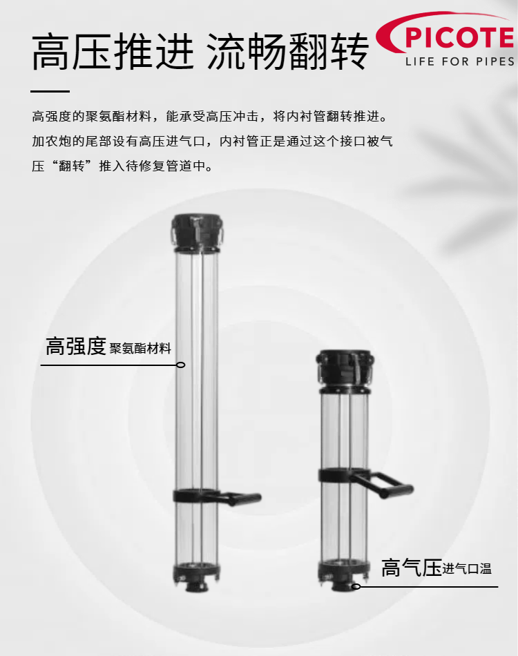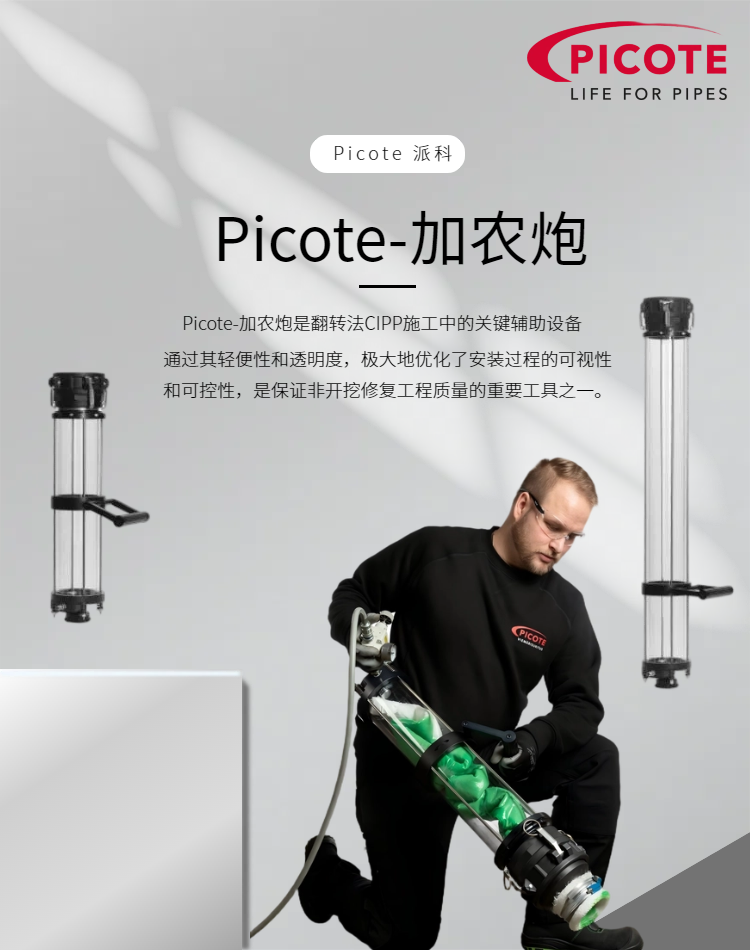 Picote加农炮在CIPP修复中的关键作用这款设备单手可操作,便于携带和小空间操作。高透明度的聚氨酯材料制成的筒状体,让浸透和内衬管翻转过程一清二楚。高强度的聚氨酯材料,能承受高压冲击,将内衬管翻转推进。 Picote-加农炮,一款专为CIPP翻转法设计的小设备,用于安装CIPP内衬。使用时,将内衬管的一端与加农炮的前端绑扎起来,确保连接紧密不泄气,内衬管的另一端在筒状体的内部。加农炮的尾部设有高压进气口,内衬管正是通过这个接口被气压“翻转”推入待修复管道中。 机器运转时,我们可以看到:内衬管是否开始顺利翻转。树脂是否均匀浸透,有无白色干点。内衬管在进入旧管道时有无扭曲、折叠或卡住现象。整个安装过程是否顺利。这个小设备便于我们及时发现问题并采取措施哦。 |